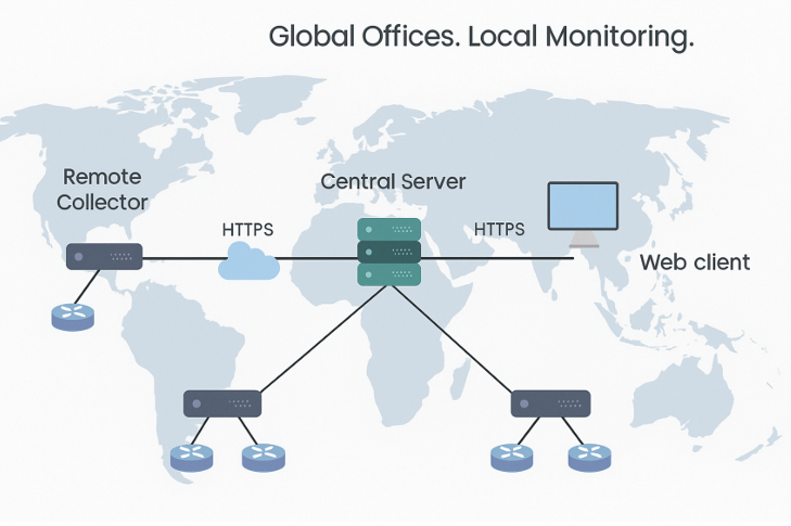• Central Server (HQ): Core management console that aggregates flow data from probes, provides a unified dashboard, and generates enterprise-wide reports.